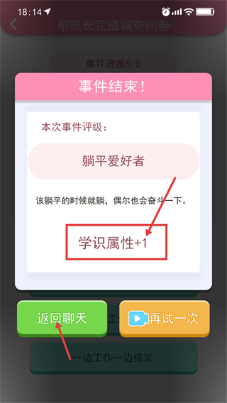 4、完成问卷后事件进度达【5/5】,可获得【学识属性+1】的奖励,点击【返回聊天】可回到对话界面。