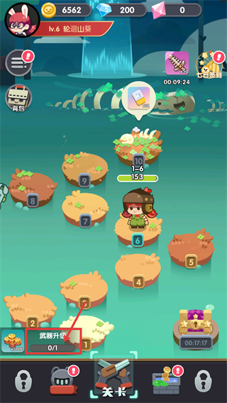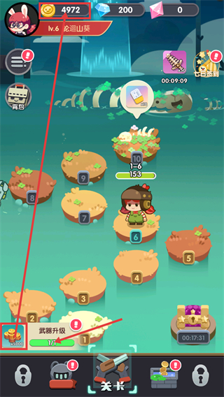 1、在关卡选择界面,留意【武器升级-0/1】提示,优先完成该任务,可消耗金币提升战力。