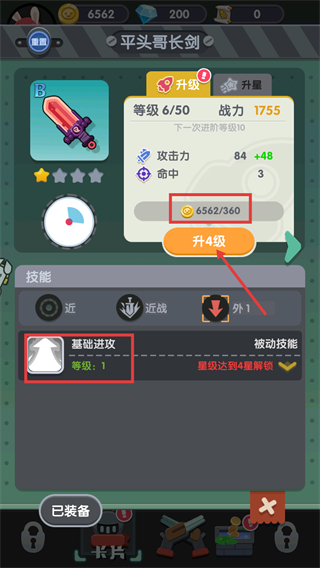 2、进入【平头哥长剑】界面,检查【6562/360】金币是否充足,点击【升4级】提升武器等级。