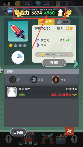 3、武器升级后战力会上涨,如【战力-6874-+960】,注意后续升级需满足金币与材料条件。