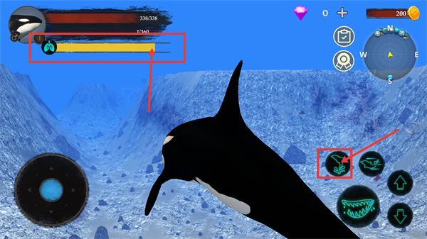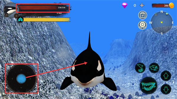 2、通过左侧【摇杆】控制虎鲸移动,关注左上角【338/338】生命值与氧气条,确保状态稳定以持续探索海域。