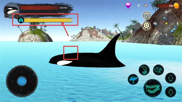 3、当氧气条不足时,操控虎鲸上浮至海面,同时使用右侧【呼吸技能】恢复氧气,避免因缺氧损失生命值。
