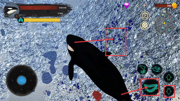 1、发现鱼群后,操控虎鲸靠近目标,点击右侧【攻击技能】发起捕猎,同时维持氧气条状态,确保捕猎过程不中断。