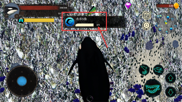 2、关注【击杀5鱼】任务进度(当前2/5),优先捕猎小型鱼类完成任务,同时积累金币提升虎鲸属性。