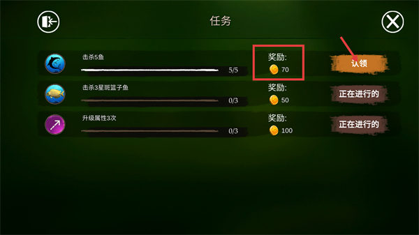 4、进入任务界面,点击【认领】获取【击杀5鱼】对应的70金币奖励,这些金币可用于升级虎鲸的生命值、攻击力等属性。