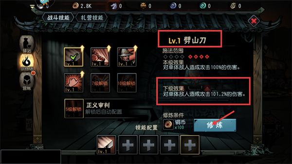 1、在训练场可消耗【100-铜币】修炼【Lv.1-劈山刀】,升级后其单体伤害会提升至101.2%,增强输出能力。