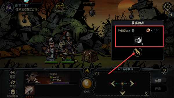 4、找到密封宝箱后可获得【队伍经验×58】【铜币×107】等奖励,点击拾取即可存入行囊推进副本进度。