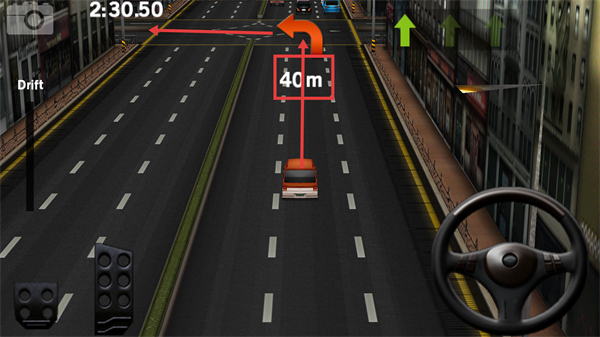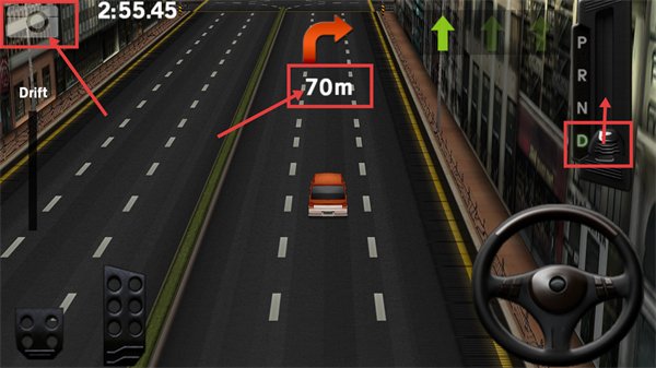 2、驾驶时切换至【D档】前进,看到【70m-右转标识】时,提前减速调整方向,配合【Drift】操作平稳过弯。