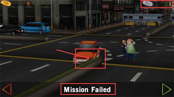 4、若因碰撞触发【Mission-Failed】,可收集场景中的硬币积累资源,重新挑战时注意规避道路障碍。