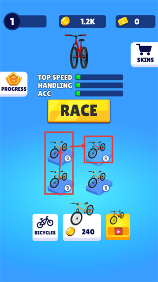 1、将相同等级的自行车合并,可解锁更高阶车辆,提升【TOP-SPEED】【HANDLING】等属性,增强比赛竞争力。
