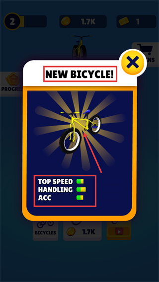 2、解锁【NEW-BICYCLE】后,其【TOP-SPEED】【ACC】等属性会更优,替换当前车辆可提升比赛中的表现。
