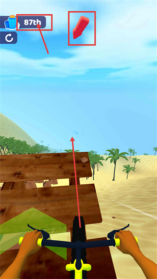 3、比赛中留意当前排名【87th】,跟随红色箭头指引的路线前进,可避开障碍并找到加速区域提升名次。