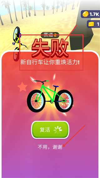 4、若出现【失败】提示,可选择用新自行车【复活】继续比赛,或点击“不用,谢谢”重新开始挑战。