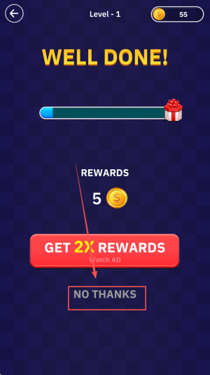 4、领取奖励:出现“WELL DONE!”后点击“GET 2X REWARDS”完成关卡。
