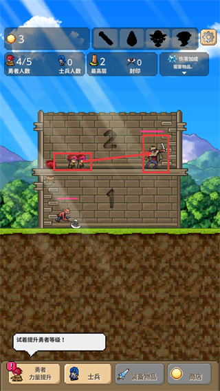 2、消耗【3】金币点击【等级提高】,可提升勇者的【HP4】-【攻击力1】等属性,强化作战能力。