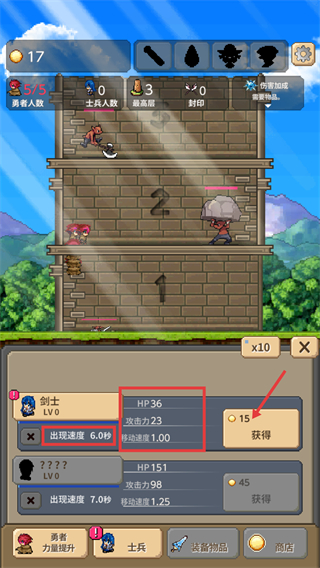 3、积累【15】金币解锁【剑士-LV0】,其【HP36】-【攻击力23】可助力应对更强敌人。