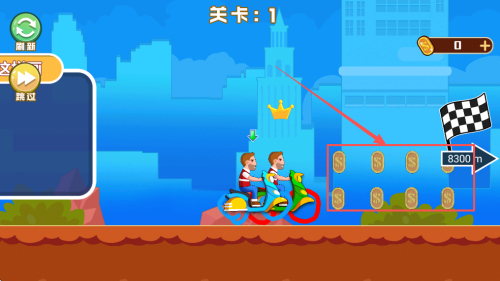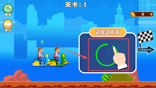 3、开始画线:于“关卡:1”界面画线引导摩托车前进至10064m。