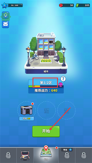 1、在城市界面确认【第1/2区】-【推荐战力-640】,点击【开始】进入该区域的战斗关卡。