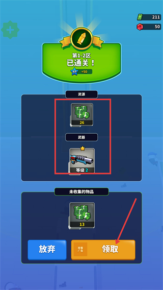 4、通关【第1-2区】后点击【领取】,获取【26】资源与【等级-2】武器,积累战力推进后续区域。