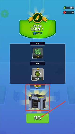 4、通关【第1-3区】后,点击【领取】获取【普通宝箱-等级3】等奖励,用于后续资源积累与武器强化。