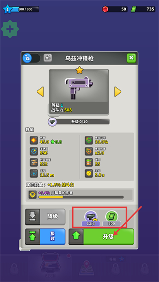1、升级【乌兹冲锋枪】时,消耗【12/3】对应道具与【500】资源,提升其【战斗力-508】等属性,增强输出能力。