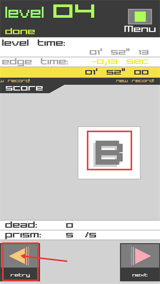 4、通关后查看【level-time】等数据,若需优化成绩点击【retry】重玩。