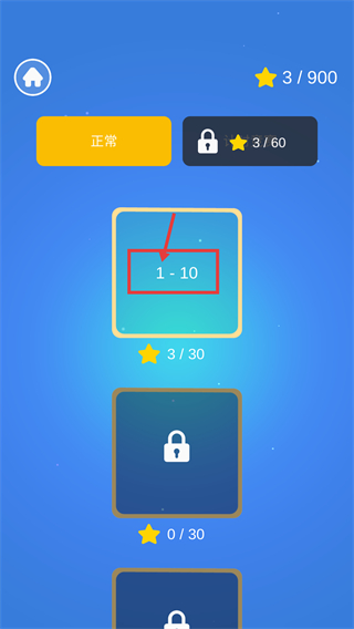 1、进入关卡选择界面后,优先挑战已解锁的【1-10】关卡,积累【星星-3/30】以解锁后续内容。
