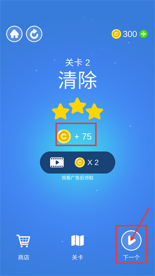 4、关卡结算后会获得【金币-+75】,点击【下一个】按钮可进入后续关卡,也可观看广告翻倍奖励。