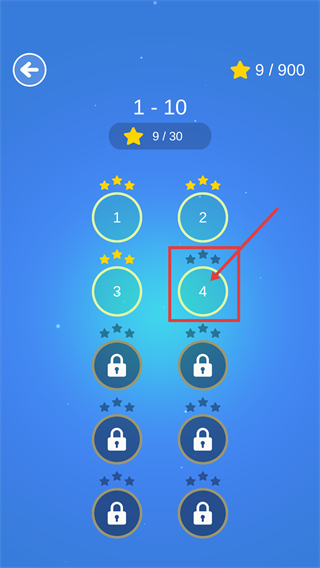 1、在【1-10】关卡列表中,选择已解锁的【4】关卡进入,当前累计【星星-9/30】可解锁更多关卡。