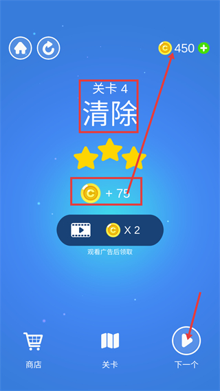 4、【关卡4】清除后会获得【金币-+75】,点击【下一个】可进入新关卡,也可看广告翻倍奖励。