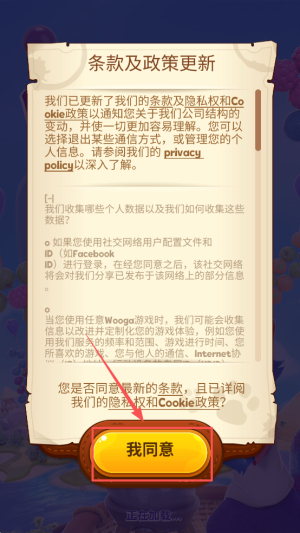 1、查看更新提示:打开游戏弹出条款更新弹窗,直接点“我同意”继续加载。