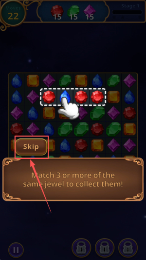 2、学习规则:在关卡提示页阅读“Skip”说明,记住连线三颗同色宝石即可消除。