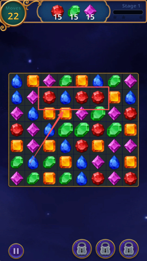 2、精准凑集消除:观察宝石布局,定位同类宝石位置,通过滑动调整使其形成三颗及以上的组合完成消除。