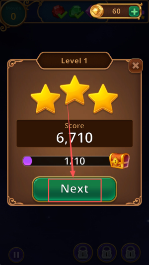 4、领取奖励:通关后查看结算页60分与6710积分,点“Next”继续下一关。