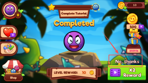 4、进入商店:点击“Shop”按钮,用刚获得的金币购买道具,或点“No, thanks”继续下一关。