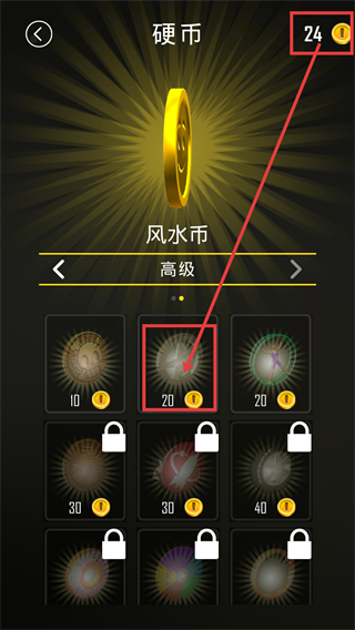 1、在硬币选择界面,当前拥有【24】枚硬币,可解锁【高级】类的20硬币道具,比如【风水币】,提升关卡收益。