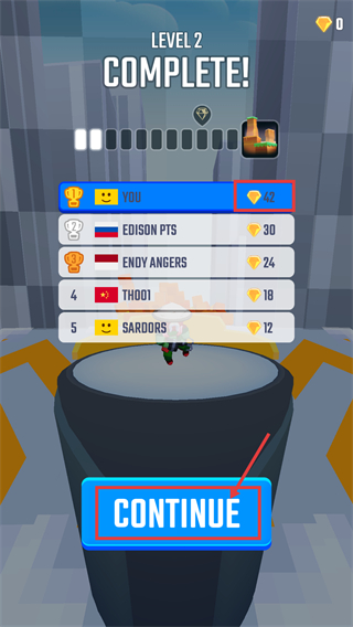 4、关卡完成后,点击【CONTINUE】进入下一关,同时可查看当前获得的【42-钻石】等奖励。