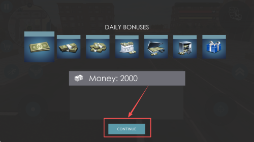 3、领取奖励:在每日奖励界面,点击“CONTINUE”领取奖励,增加初始资金。