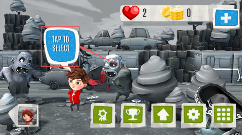 1、了解界面:进入游戏后,你会看到一个卡通角色和一些僵尸,界面上方显示生命值和金币数量,点击“TAP TO SELECT”开始游戏。