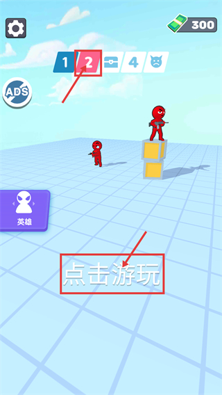 1、点击【点击游玩】进入关卡,界面上方的【2】标识对应当前关卡,同时可查看【ADS】标识及英雄按钮。