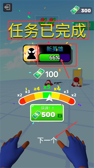 4、任务完成后点击【获得!!】领取【100】及【500】货币,同时新英雄解锁进度提升至【66%】,可点击【下一个】进入后续关卡。