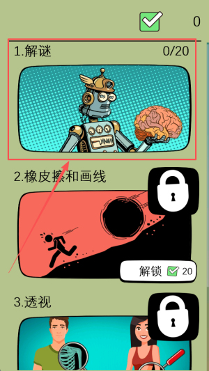 4、解锁道具:完成教学关后返回主界面,点击“2.橡皮擦和画线 解锁20”,继续挑战下一关。