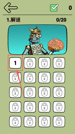 1、进入游戏:打开游戏主界面,点击“1.解谜”标签,看到进度“0/20”后选择“教学关”。