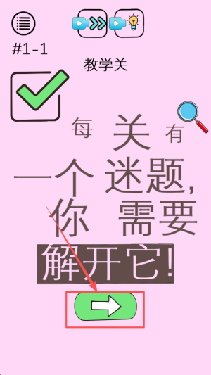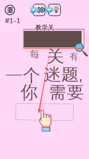 2、选择关卡:在关卡列表点“#1-1”,阅读提示“每关有迷题需要”,确认进入教学关。