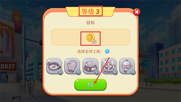 1、进入【等级2】界面后,确认目标为收集【3-份煎饼】,点击【玩】按钮开启关卡,支持工具暂未解锁可后续关注。