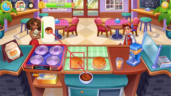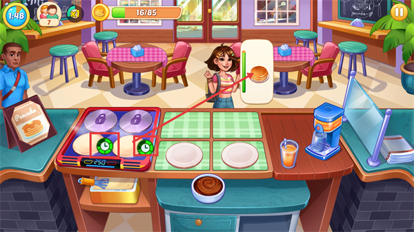 3、制作好【巧克力酱煎饼】后,将其匹配到对应顾客的需求栏,同时可利用【计时工具】把控操作节奏。