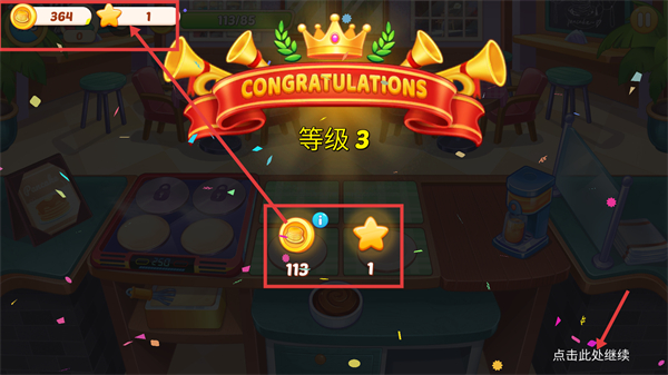 4、完成关卡后可获得【78-金币】与【1-星星】奖励,点击【点击此处继续】进入后续内容。