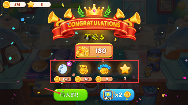 4、通关【等级5】可获得【180-金币】及【1-星星】等奖励,点击【伟大的!】按钮可进入后续内容,也可选择看广告翻倍奖励。