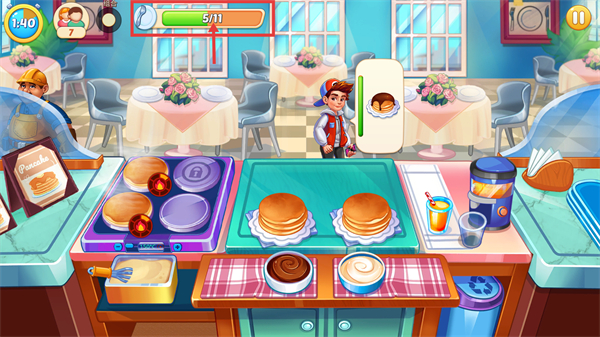 3、完成部分订单后,进度会更新为【5/11】,继续匹配剩余顾客的需求,同时留意煎饼盘的制作节奏避免堆积。
