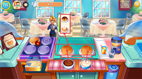 2、关卡内按顾客需求,将煎饼搭配【巧克力酱】或【奶油酱】,制作对应品类的煎饼以完成订单,推进进度。
